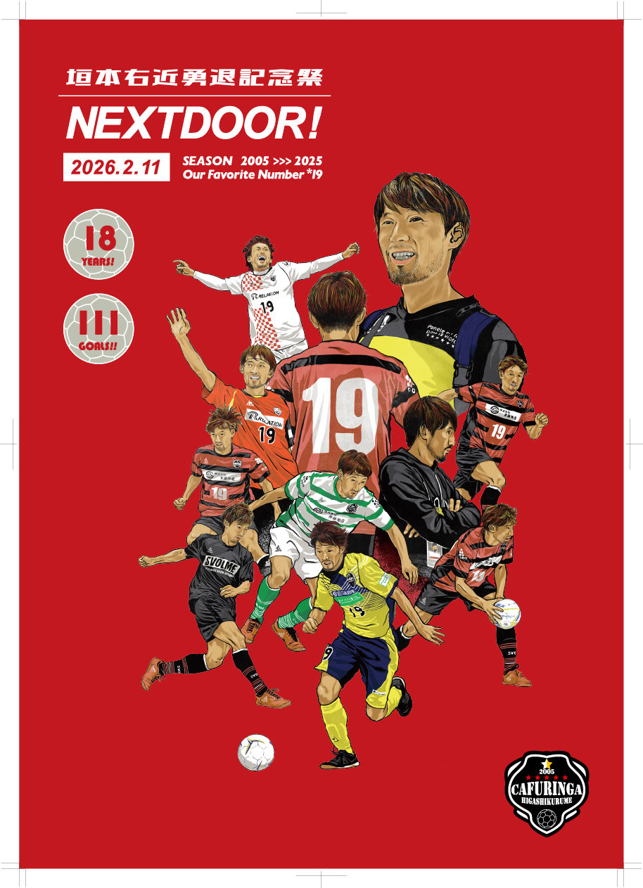 垣本右近 選手『NEXTDOOR!』キービジュアル藤原 徹司2月9日読了時間: 1分友人でもある「カフリンガ東久留米」代表垣本 右近 選手の勇退記念祭《NEXTDOOR》のメインビジュアルを描きました!よくある「引退試合」のようなビジュアルを参照にいつもより太めの線でデジタル作成しています。足掛け18年 111ゴール いち選手の人生の「節目」のお手伝いできるというのは大変光栄です☆